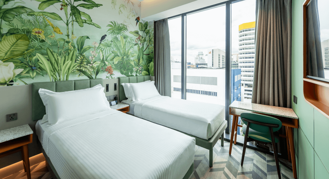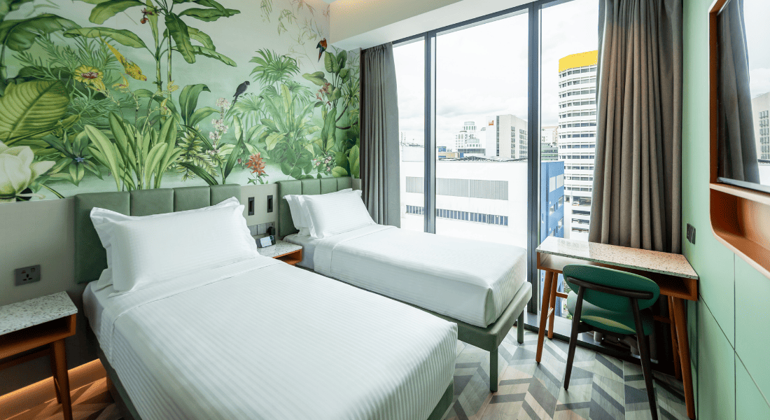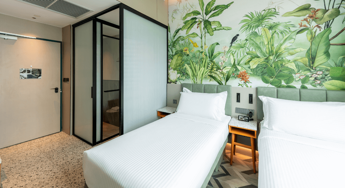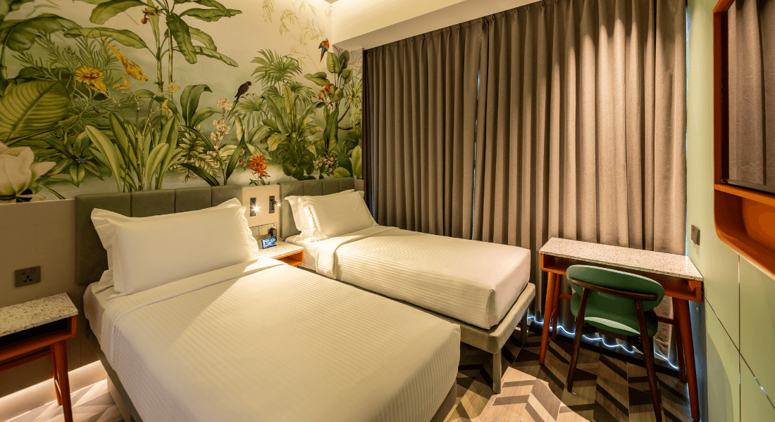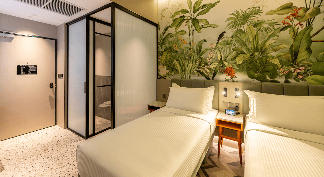 The Deluxe Room with 2 Single Beds at Hotel Waterloo Singapore – Handwritten Collection offers twin beds, soft ambient lighting, and contemporary comforts. Premium touches include a Nespresso machine, local snacks & drinks, and plush bathrobes. Smart in-room features such as voice-controlled lighting, air-conditioning, Smart TV, mobile check-in, and keyless access provide a seamless, modern stay in the heart of Bras Basah-Bugis.
